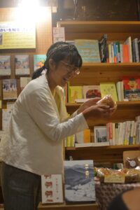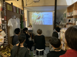 2カ所目の会場は、思考の幅を広げるため、選択肢を増やすため、社会とつながるための本屋「TOTEN BOOKSTORE」。「搾取から連帯へ。食べ物で繋がる世界、バナナから見えること」と題したトークイベントを開催しました。「TOTEN BOOKSTORE」では、9月末から原画展とバランゴンバナナについて説明したパネル展示を行っていたこともあり、興味関心を持ってくださった方が数多く集まってくださいました。バランゴンバナナの背景を説明した後に、絵本の文を担当したらくだ舎出帆室の千葉貴子さんから絵本に込めた思いや制作の裏話もあり、充実した内容の会となりました。