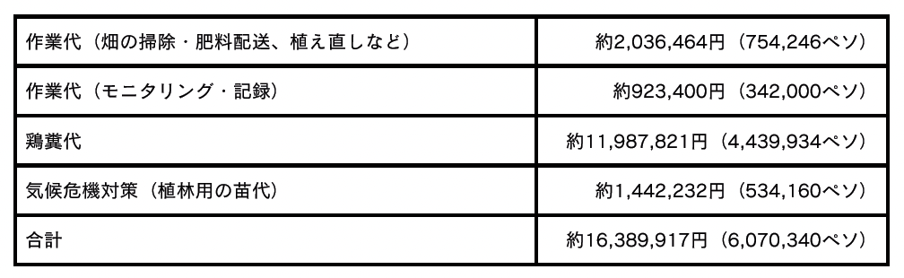 家の全壊や家畜の消失などの深刻な被害を受けた卒業生には、1人あたり20,000ペソ(約54,000円)相当の家の建築資材や家畜を現物支給、農作物の被害などを受けた卒業生には、1人あたり5,000ペソ(約13,500円)を現金支給。