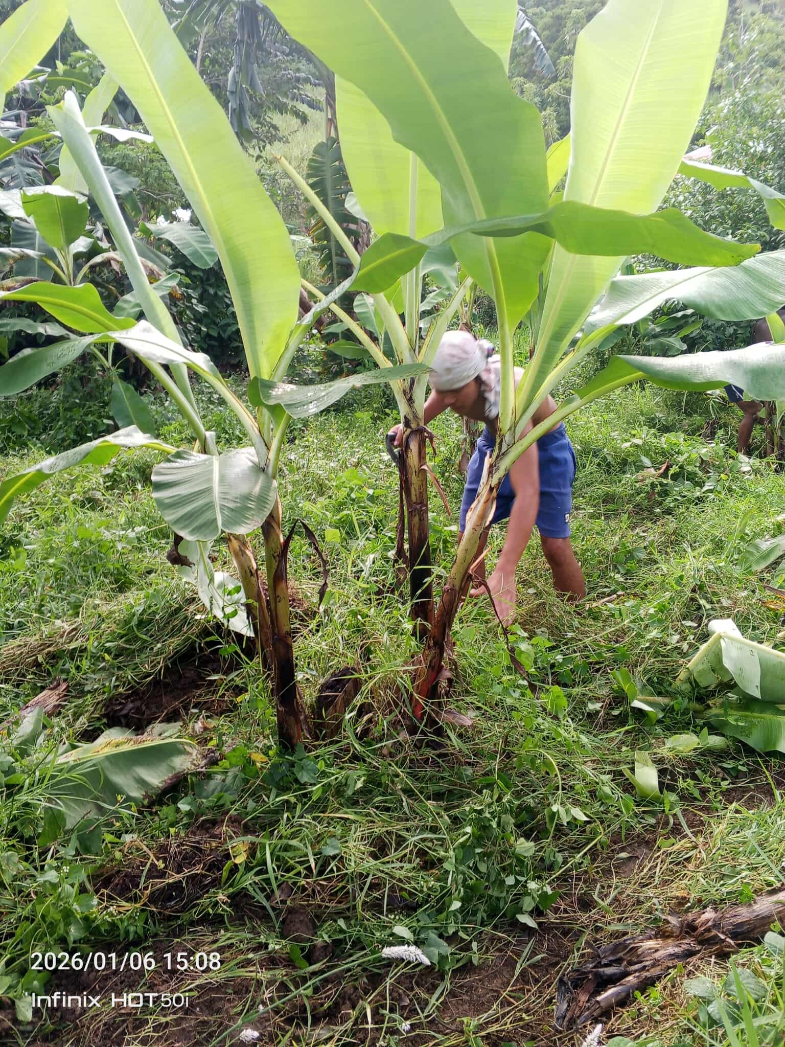 昨年11月の台風で被害を受けたバナナの手入れも。